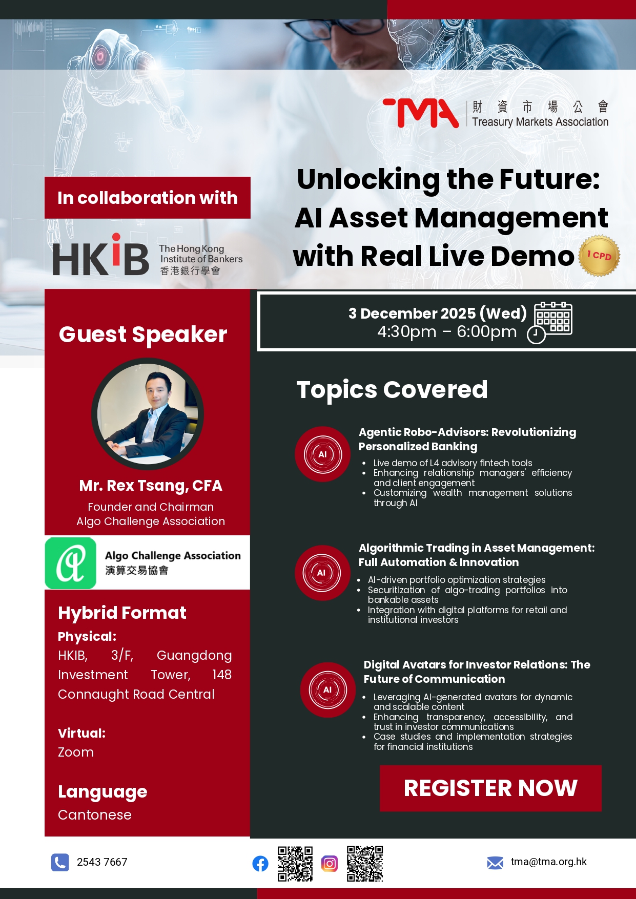 [Unlock the Future: AI Asset Management with Real Live Demo]In collaboration with the Treasury Markets Association ( the HKIB will host a seminar exploring transformative fintech innovations that are reshaping the financial landscape This seminar will focus on three key areas driving the future of the industry agentic robo advisors, fully automated algorithmic trading, and AI powered avatar YouTube channels for investor relations